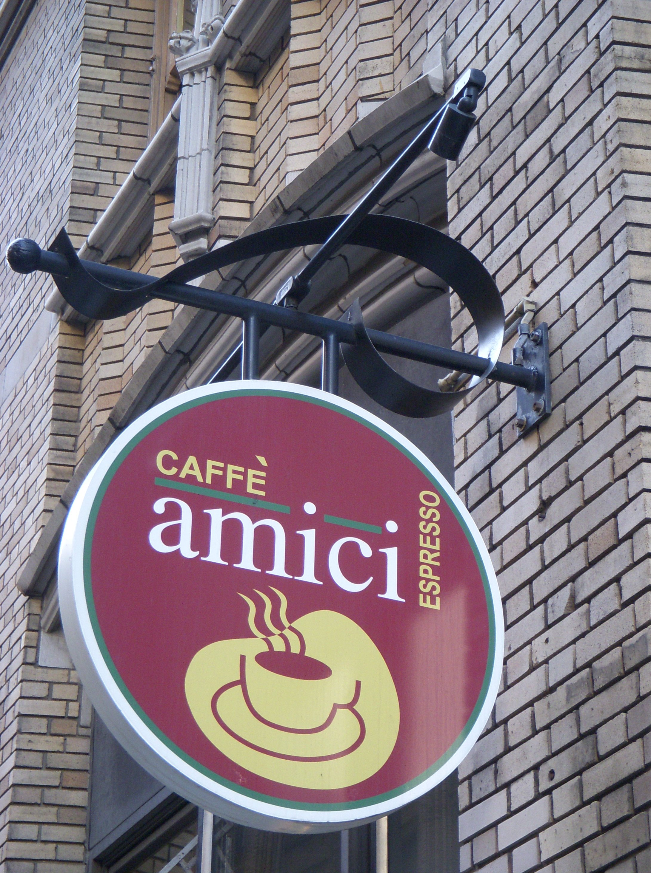 A sign has letters or decals on wood, metal, etc. and can hang perpendicular over the sidewalk, lay flush against the wall, etc.